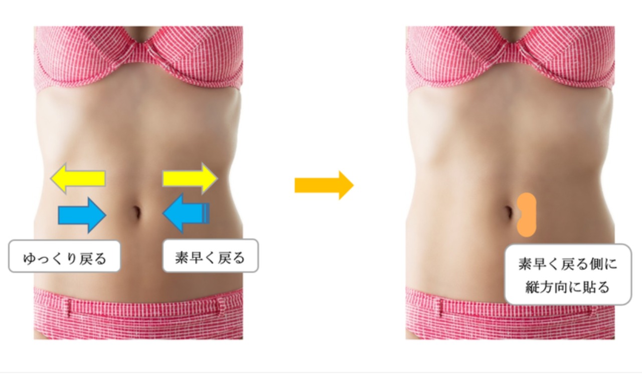 ③ 素早く戻る側に、リミットレスボディバランステープをおへその端に対して5㎜~1㎝の間を空け縦方向に垂直に貼る。
